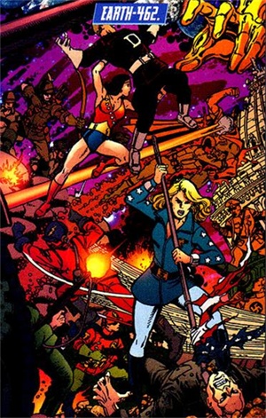 An Earth that appears to still be in the throes of WW2. Alternate versions of Wonder Woman, Wonder Girl, Flash, Robin, Green Arrow and possibly Starfire exist, as well as Per Degaton and Baron Blitzkrieg.