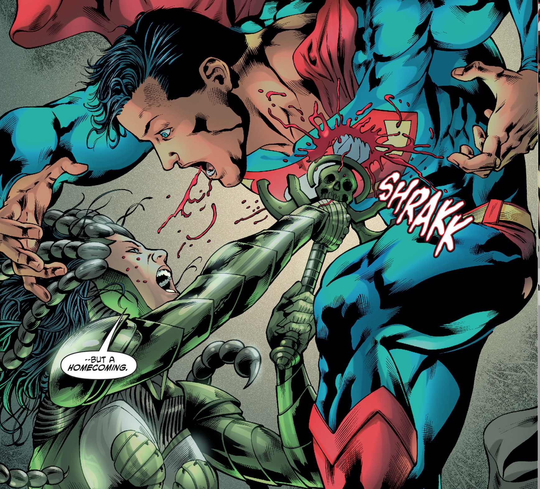 Wonder Woman leads an army of the dead filled with rage. She slaughters the members of the Justice League before killing Superman.